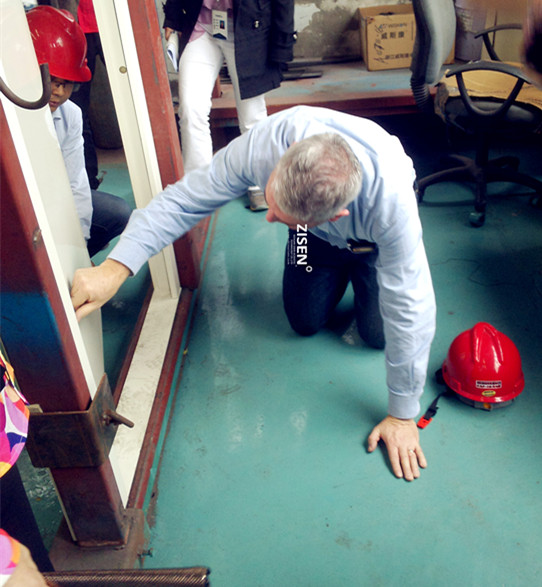 Mike走近样品隔声门,“听门开启时有无异响、查门缝的均匀度、门整体的平整度、门开启时的灵活度、胶条安装的牢固性、门底部插槽使用的材料及结构方式”等各项指标,仔细检查了隔声门的生产质量。为更清楚的查看隔声门底部插槽,Mike直接跪在地上用手一点点地触摸隔声毡包裹的情况,并就此区域隔声结构设计提议公司采用提升铰链,且现场绘制提升铰链的图纸及讲解此铰链的工作原理;就门扇内部结构,Mike认真听取生产主管雷长军的介绍后,仔细了解点焊机的各项参数并就点焊工艺加工隔声门进行了优劣分析;谈及表面处理时,Mike细微地问到公司采用是哪种打磨工具?使用的是哪种微粒的砂纸?