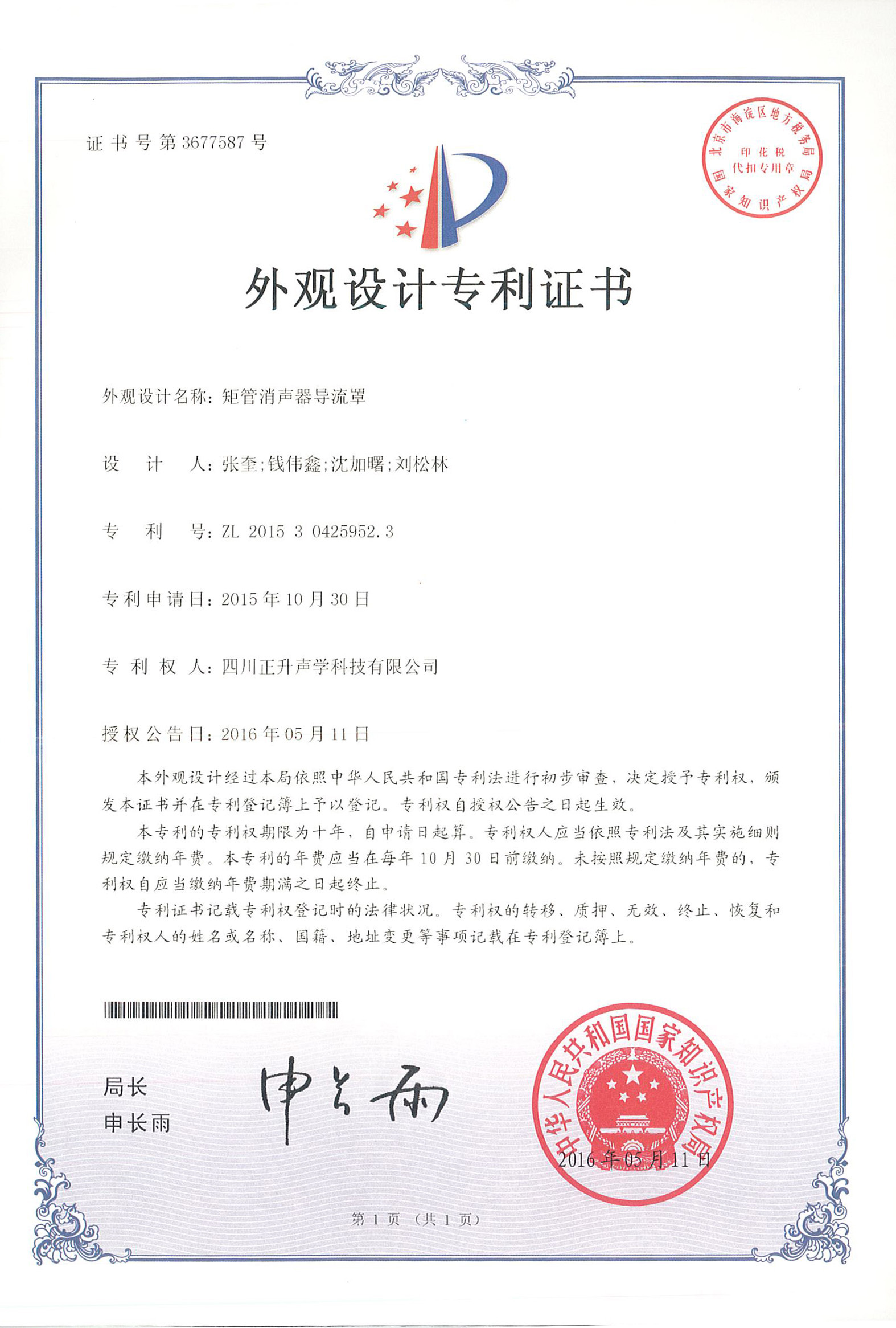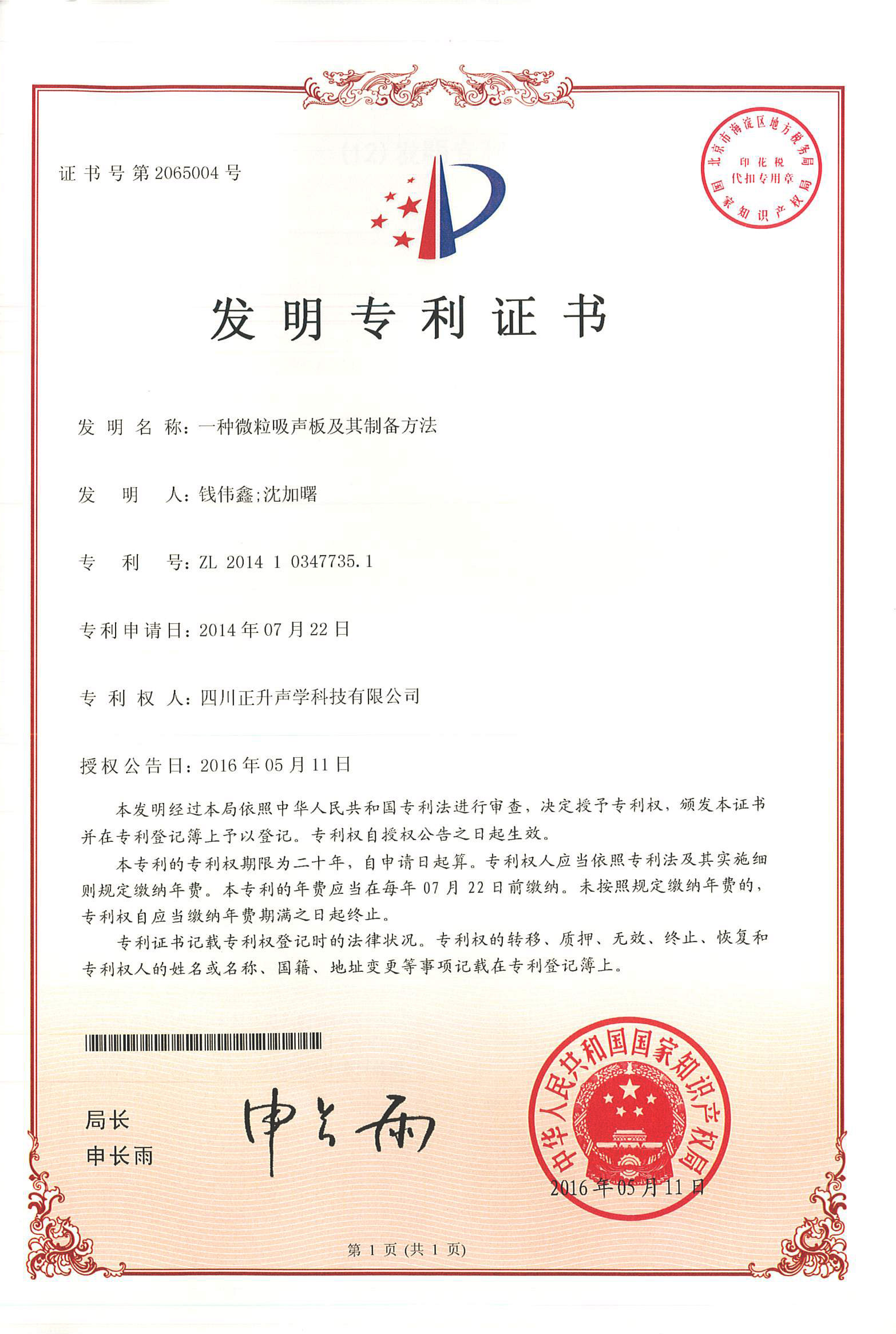 公司板式聚合微粒降噪结构、悬挂式聚合微粒吸声模块、矩管消声器导流罩、一种微粒吸声板及其制备方法、一种景观化的聚合微粒吸隔声声屏障等实用新型专利授权且颁发证书