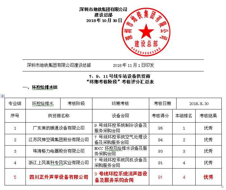 此次考核,是深圳市地铁集团有限公司建设总部车站设备中心、合约法律中心、安全质量中心等部门在2018年第三季度,对深圳地铁7、9、11号线车站设备供货商进行的终期阶段考核及综合评价考核,正升公司作为环控给排水组的24个合同设备供货商之一,参与此次进行了考核工作,最终正升以总分91分、小组总排名第四的突出表现,获得终期阶段考核“优秀”评价。
