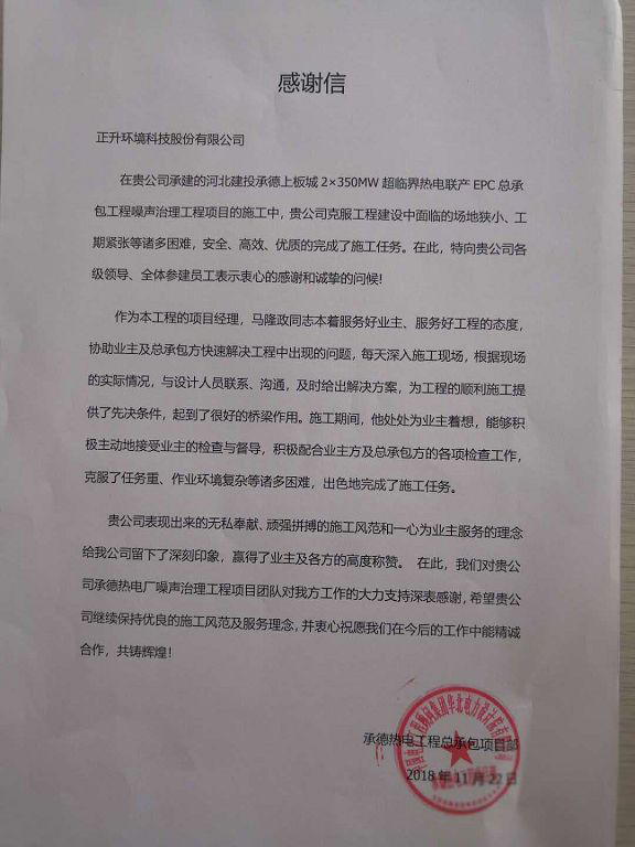 感谢信最后也向以马隆政为代表的正升团队成员,所表现出来的无私奉献、顽强拼搏的施工风范和一心为业主服务的理念,给予了高度称赞。感谢信对正升负责的承德热电厂噪声治理工程项目团队工作深表感谢,希望正升继续保持优良的施工风范及服务理念,并衷心祝愿能与正升在今后的工作中能精诚合作、共铸辉煌!
