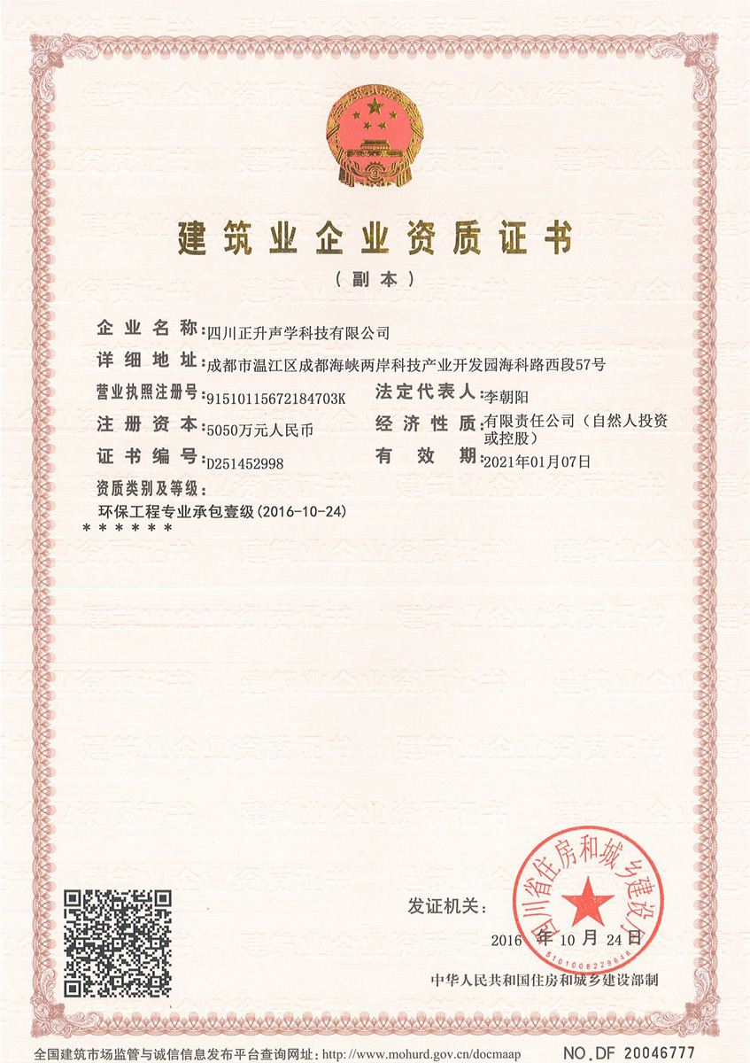 经过正升声学公司一年多的努力,新的资质证书升级申请又传来好消息。近日,经四川省住房和城乡建设厅批准,正式向我公司颁发了环保工程专业承包一级资质证书。这标志着正升公司将可承担各类环保工程的施工项目,正升也成为同行业为数不多的取得该资质的企业。正处在快速发展期的正升声学公司,经营范围不断扩展,工程业绩不断提高。为促进公司经...